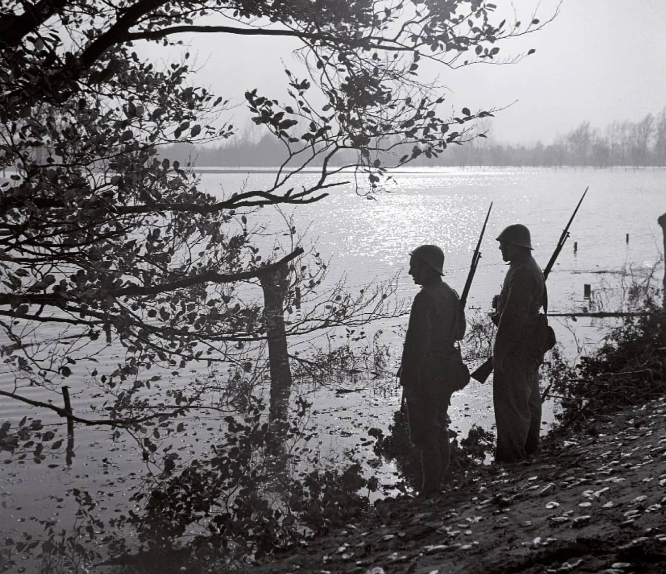 In december 1939 siert deze iconische foto de voorpagina van ‘De Wacht, Weekblad voor de gemobiliseerde Weermacht en het Nederlandsche volk’. De inundaties zijn gesteld en de militairen zijn op hun post: Nederland is voorbereid.