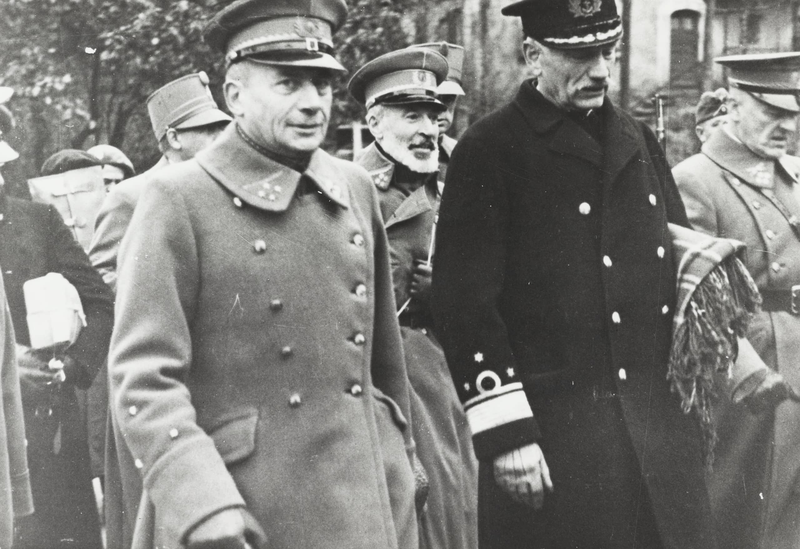 Nederlandse officieren begeven zich in Duitse krijgsgevangenschap. Op de voorgrond commandant-Veldleger, luitenant-generaal J.J.G. baron Van Voorst tot Voorst.