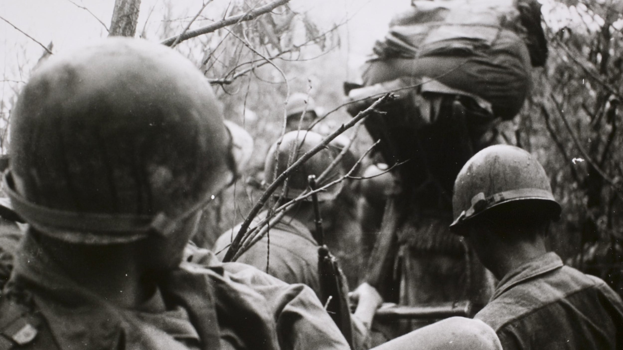 Een Nederlandse militair staat tijdens gevechten op Heuvel 975 een gewonde kameraard bij, die later aan zijn verwondingen overlijdt (mei 1951).