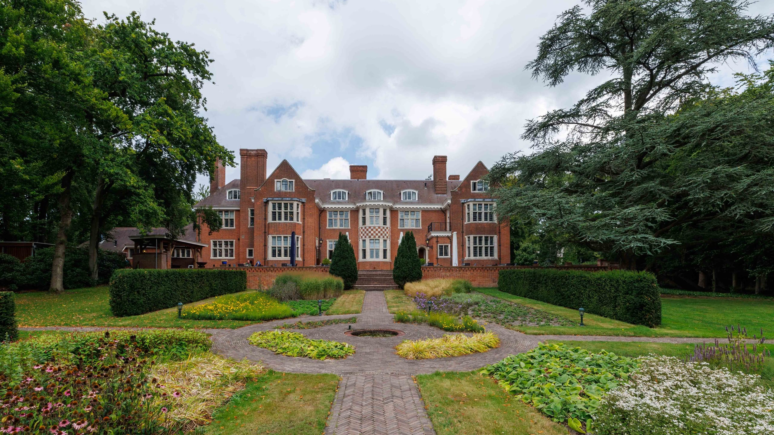 De voorkant van het landhuis. De kenmerkende Engelse landhuisstijl is duidelijk zichtbaar door onder andere de felrode bakstenen gevels en forse schoorstenen.